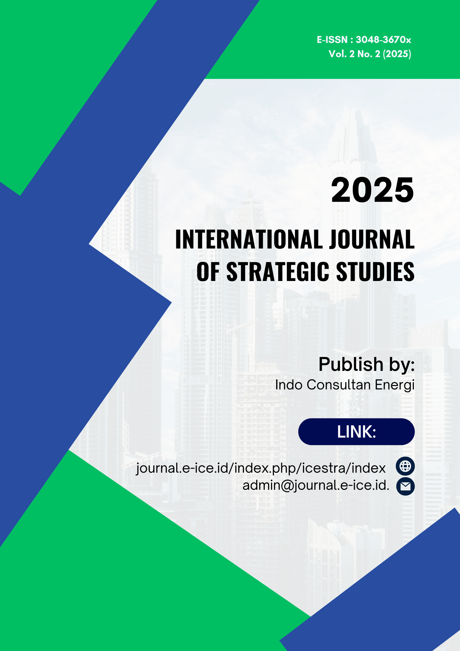 International Journal of Strategic Studies is a scientific journal focusing on developing strategic studies, including economics, education, health, humanity, religion, and others. The journal's scope is strategic studies related to social science, peace, defence, economics, education, health, humanity, and religion. This journal is expected to disseminate knowledge from theoretical and operational research related to strategic studies in various disciplines, including but not limited to social sciences, peace, defence, economics, education, health, humanity, religion, and others.
